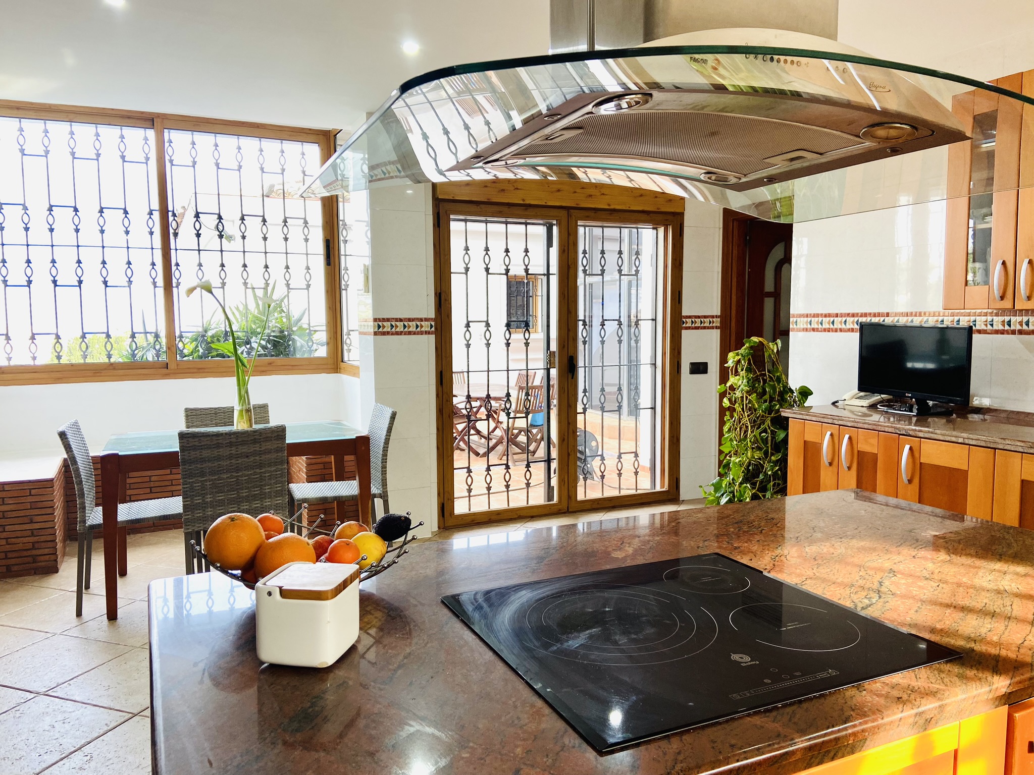 Its spacious fitted kitchen, with an island in the centre and a separate pantry, offers you all the space you need to cook comfortably. Its direct access to the terrace allows you to eat outdoors comfortably.